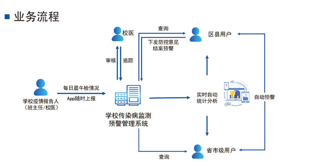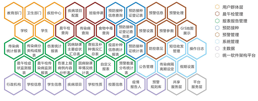 系統服務于學校傳染病早期預警監測,為學校傳染病疫情和突發公共衛生事件得以早發現、早報告、早控制提供準確、可靠的早期癥狀數據和預警,使之成為學校傳染病監測體系的第一道監測關口。系統支持幼、小、初、高、大學所有學段每日展午檢及因病缺勤情況登記、缺勤追蹤、自動預警和統計分析等功能,有效提升學校防控傳染病的能力。